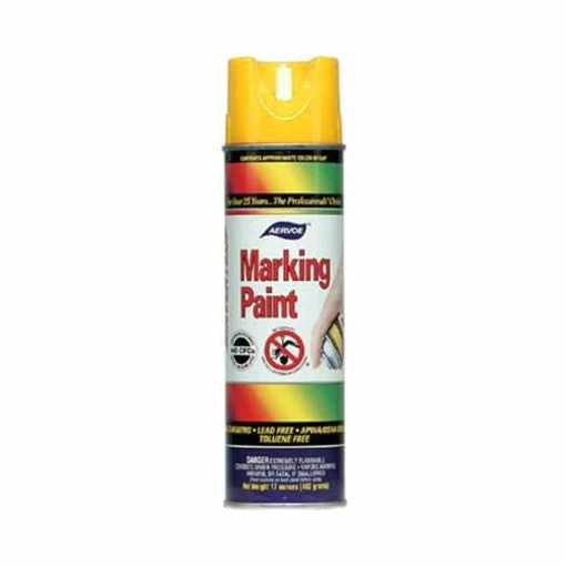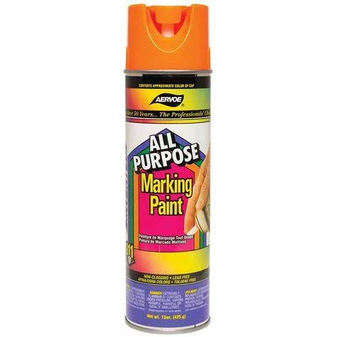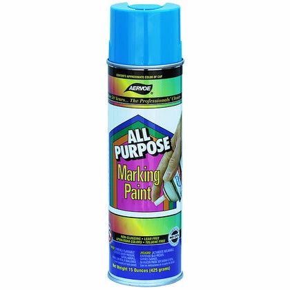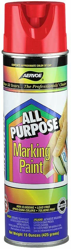 Benefits: Aervoe’s All Purpose Marking Paint is economically priced and provides good visibility in the 30-day range depending on traffic and exposure. It meets standards set by OSHA and APWA/ONE Call Systems. It is not affected by moisture or water and it will not wash away once dry. Can be used with the cap on in Aervoe applicators #1244/1245. The spray-through cap eliminates accidental discharge. Each can is non-clogging and empties completely.