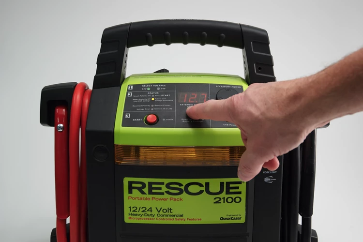 The advanced analytical display on the membrane panel provides user feedback on the state of the external battery to be jump started as well as the batteries inside the Rescue 2100. Quick Cable’s exclusive voltage and polarity protection prevents the unit from engaging when