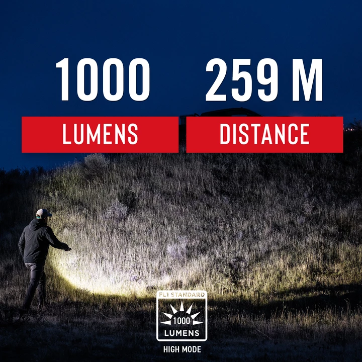 Shine bright with 1000 lumens and a beam distance of 259 meters (849 feet), plus high and low output modes. With a max run time of 11 hours on a single charge, this Rechargeable-Dual Power light can run on either a COAST ZITHION-X™ lithium ion rechargeable battery or alkaline batteries.
