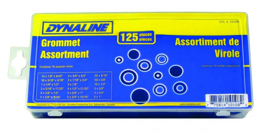 18 popular sizes of solid and hollow grommets, from 1/8″ to 1″ in diameter.