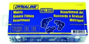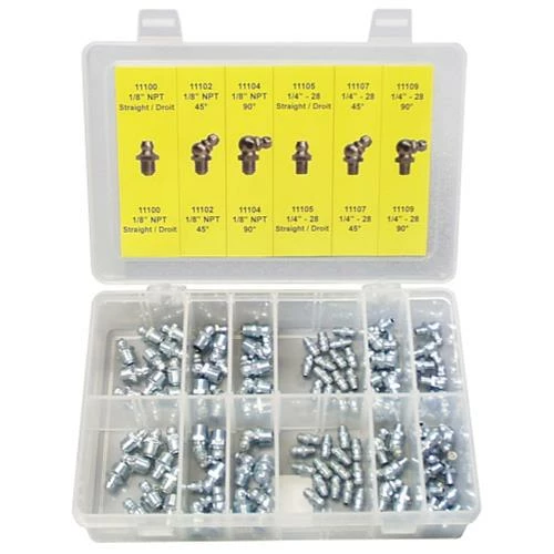 9 popular sizes of metric grease fittings contained within a sturdy plastic case