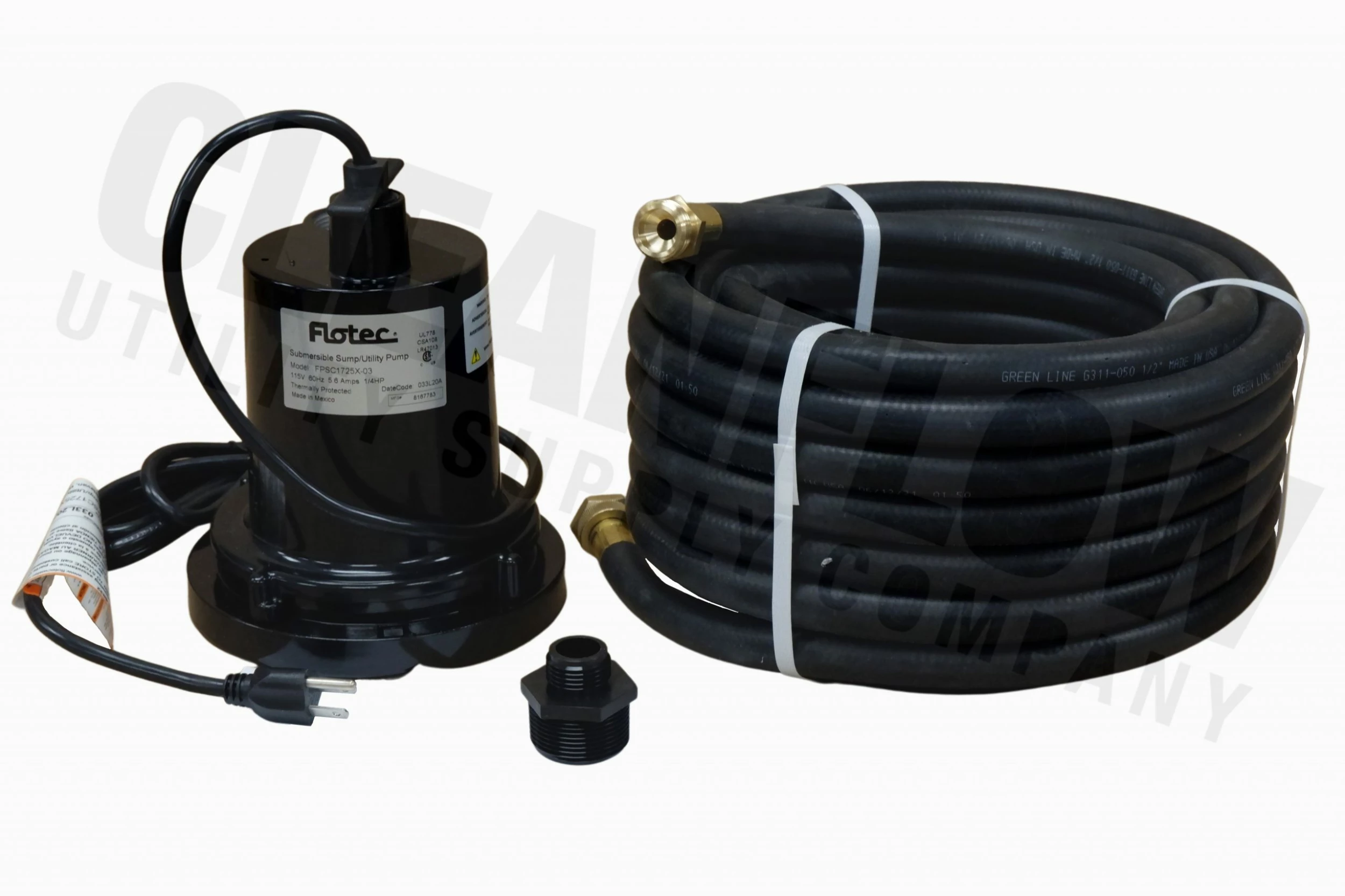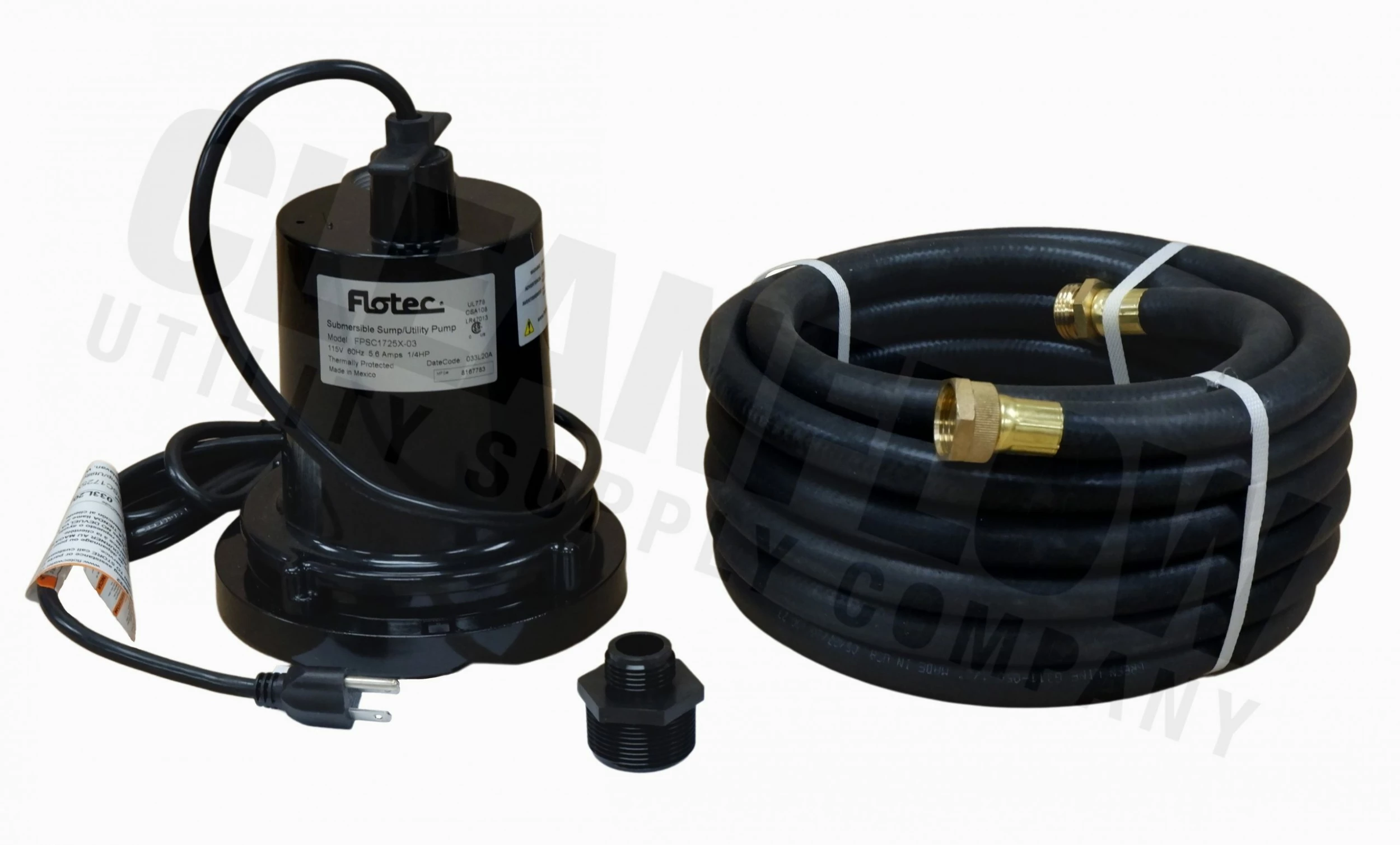 The Flotec submersible utility pump is a 120 Volt, 1/4 Hp heavy-duty, epoxy coated, cast aluminum portable utility pump with 1-1/4″ FNPT outlet. The FPSC1725X has an 8′ power cord. A garden hose adapter is provided.