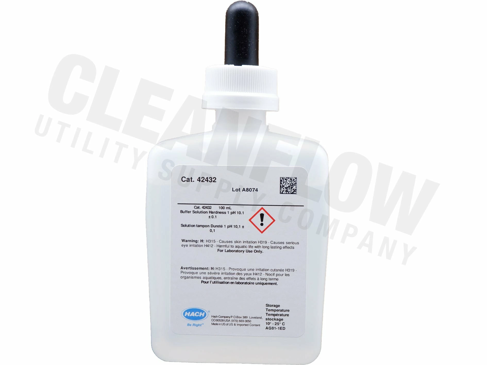 Buffer for hardness and chelant determination by titration, pH 10.1 ± 0.1 at 20°C. Hach methods 8213 and 8226. Also used in Hach Phenols method 8047. 100 mL Marked Dropping Bottle.