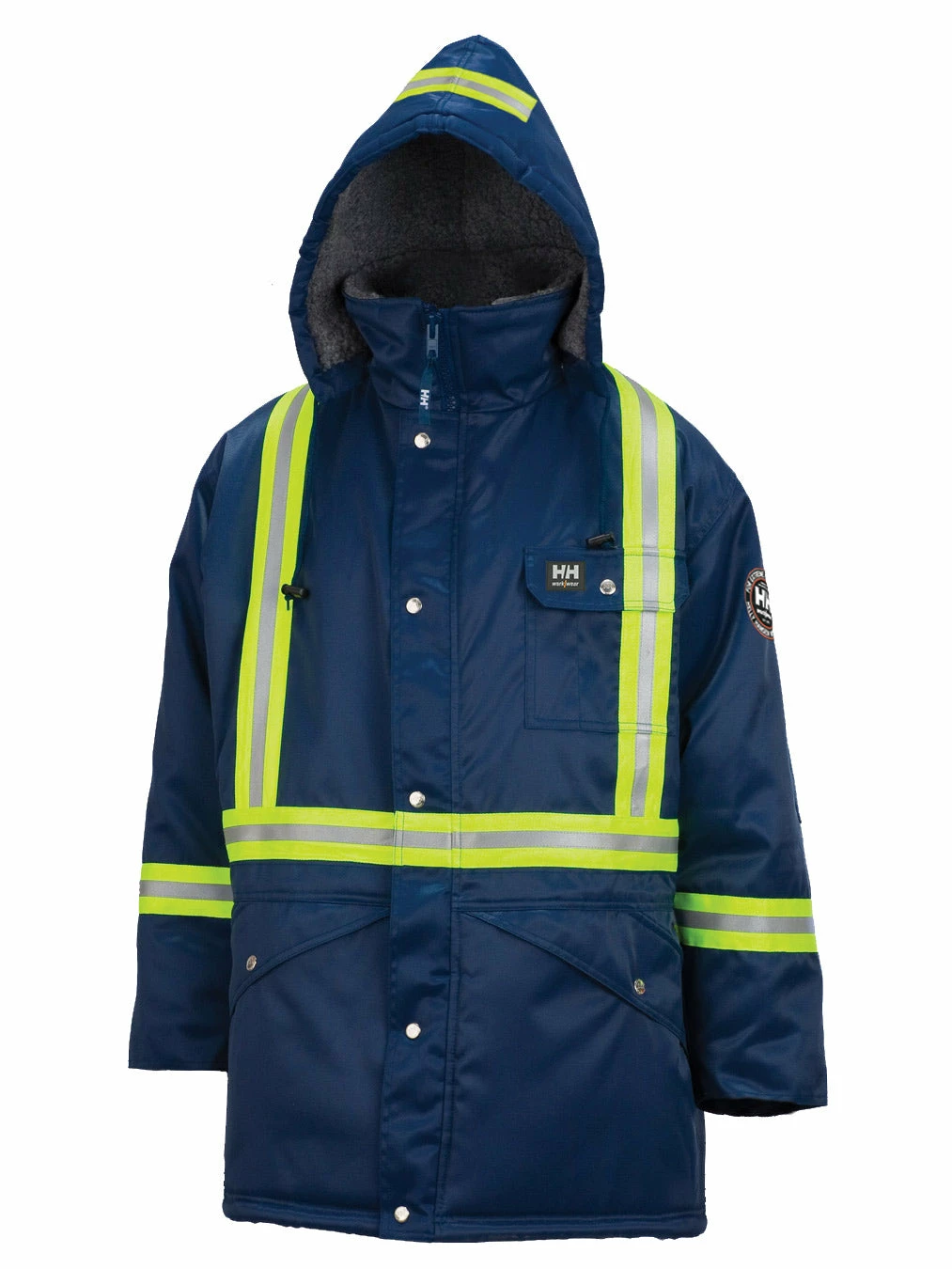 Helly Hansen’s Weyburn parka with reflective striping keeps you visible and safe when you’re working on outdoor sites. It offers a generous fit that’s ideal for layering over your work wear and its water-repellent so you’re protected when the weather gets wet. For clear days, the hood is detachable. The fit is customizable, thanks to an elasticated waist and inner wind belt. Chest pockets and front cargo pockets offer handy storage, making this jacket both practical and protective. The Weyburn Hi-Vis Parka is used in the coldest conditions on earth.