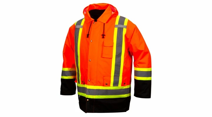 - Waterproof hi-vis polyester shell with quilted lining and storm cuffs