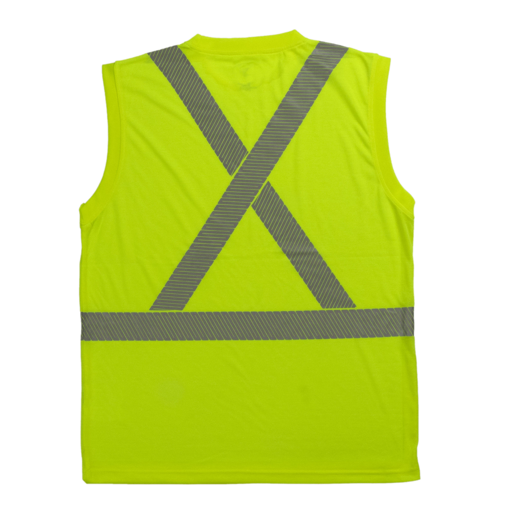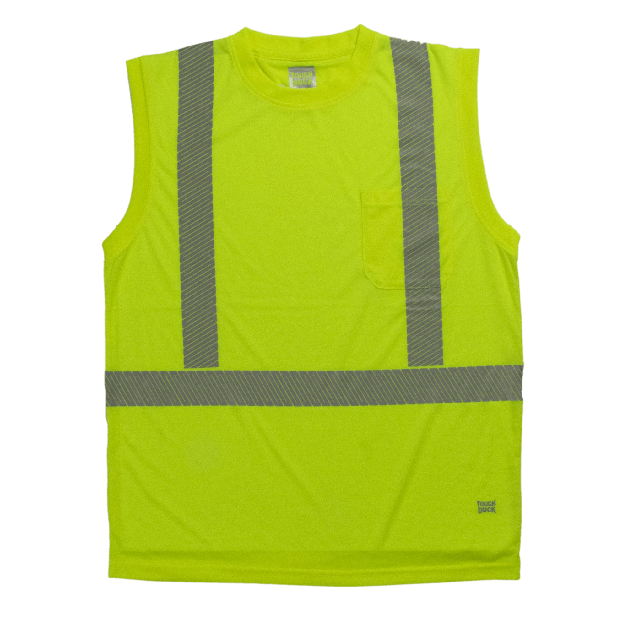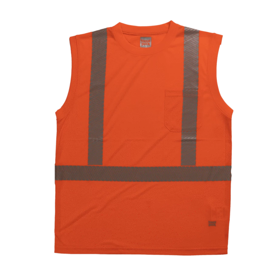 Tough Duck’s sleeveless summer safety shirt. Made of lightweight, soft, easy-to-wear polyester jersey with comfortable retroreflective striping.