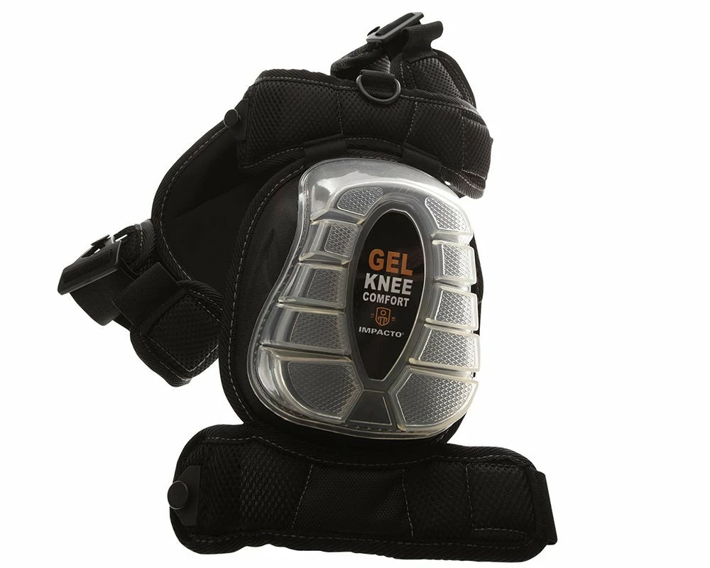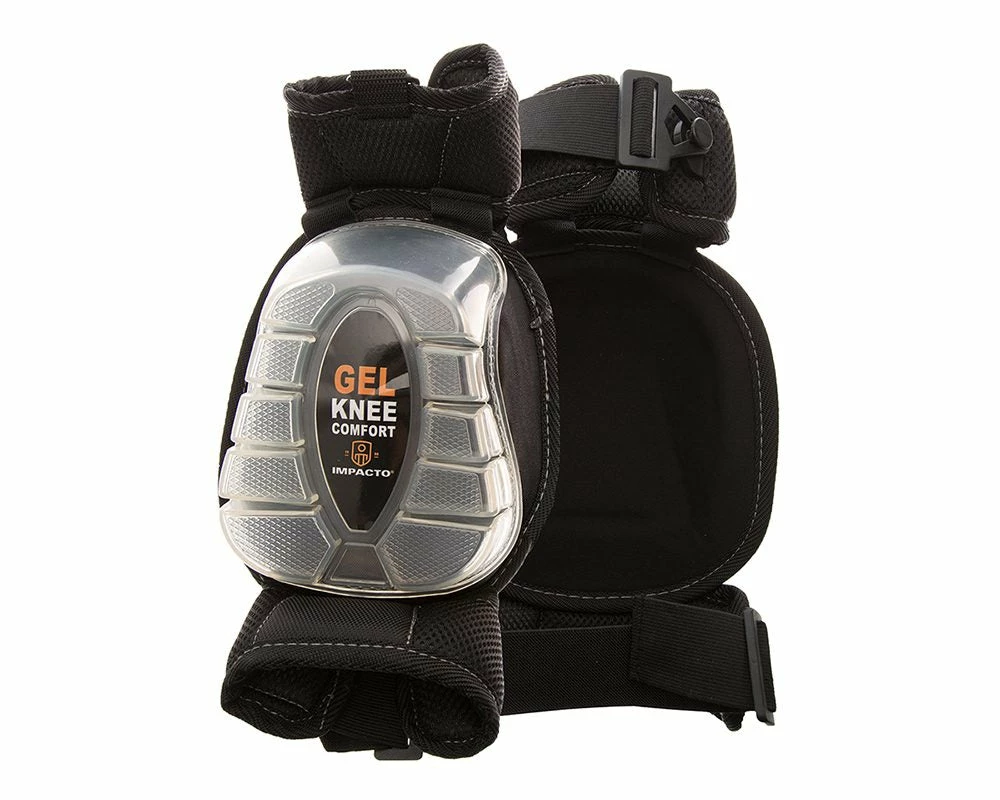 IMPACTO GELPRO Articulating Kneepads. Built using a solid injected polyurethane and Gel insert to provide comfortable knee cushioning and protection to the delicate patella bone. Enlarged outer shell with articulating feet grips the surface providing excellent stability. Strapping system positioned above and below the knee eliminates discomfort behind the knee. Elastic double straps (1.5 inch wide, top is 9 inch long, bottom is 8 inch; long without stretch). Quick clip plastic fastening system provides easy adjustment.