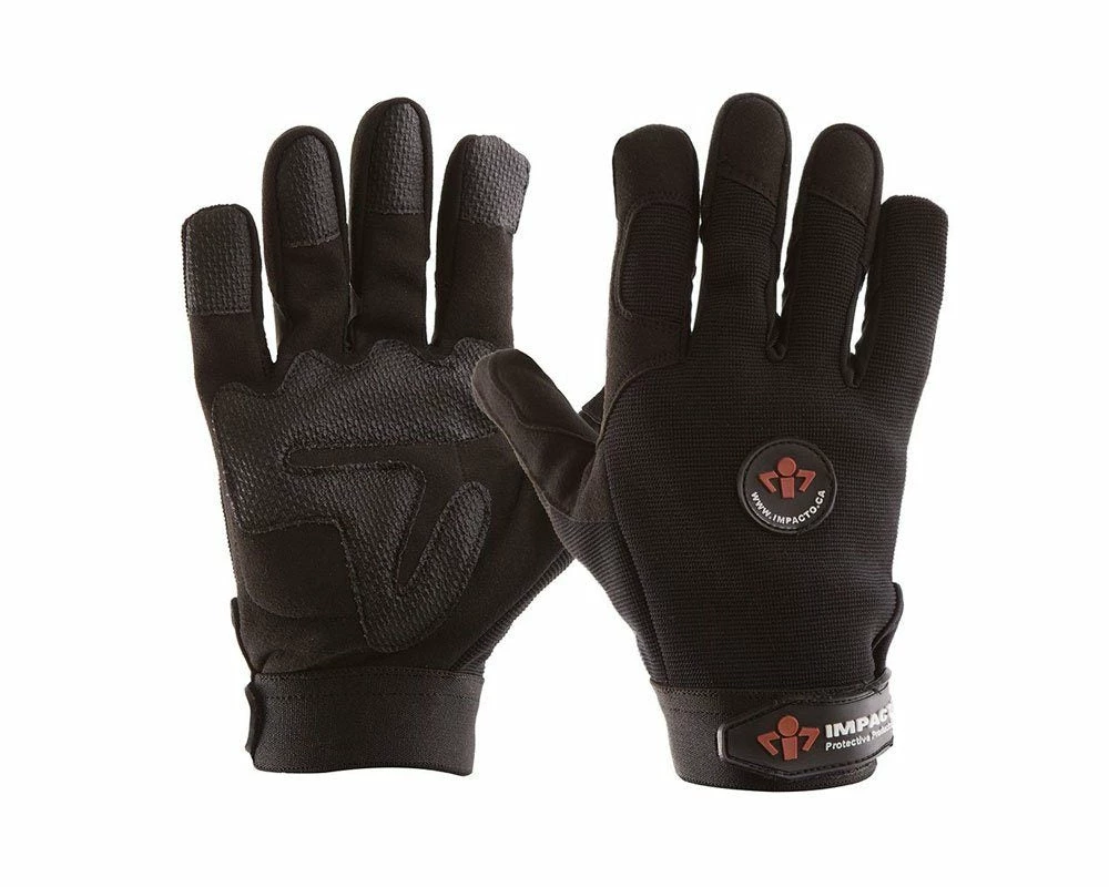 IMPACTO full finger Anti-Impact Mechanic Style Work Glove. Synthetic suede leather palm and back of fingers. Visco-Elastic Polymer VEP padding in the palm offers impact and vibration protection. Spandex back of hand provides great dexterity. Anti-slip patches in the palm and fingertips offer gripping. Elastic wrist with hook and loop closure.
