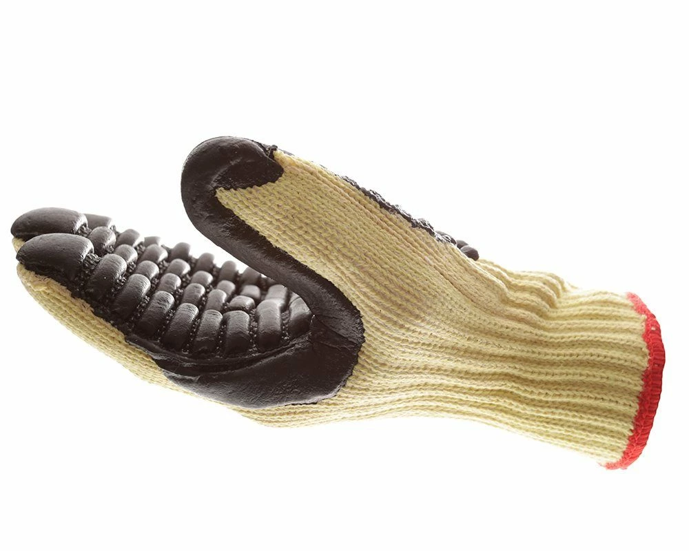 IMPACTO Anti-Vibration Anti-Slash Gloves are made with 60% KEVLAR® and 40% cotton seamless knit material (7 gauge liner). Encapsulated air coating in the palm, fingers and thumb cushion and dampen vibration and impact while ensuring optimum dexterity, lightweight feel and reduced bunching.