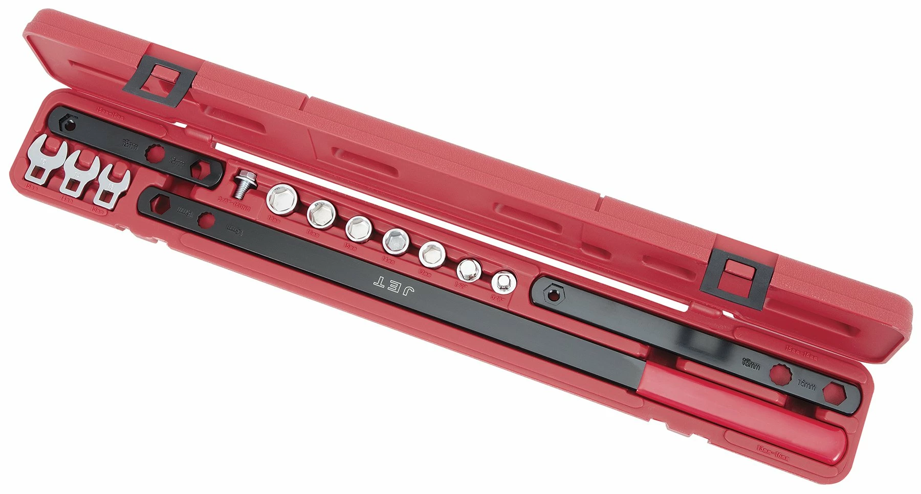 Jet H3529 14 Piece Deluxe Serpentine Belt Tool Kit enables rapid and easy removal and installation of belts on serpentine belt equipped vehicles. Connect the tool to the spring loaded idler pulley to release the tension. Fits most vehicles. Comes in convenient blow mold storage case.