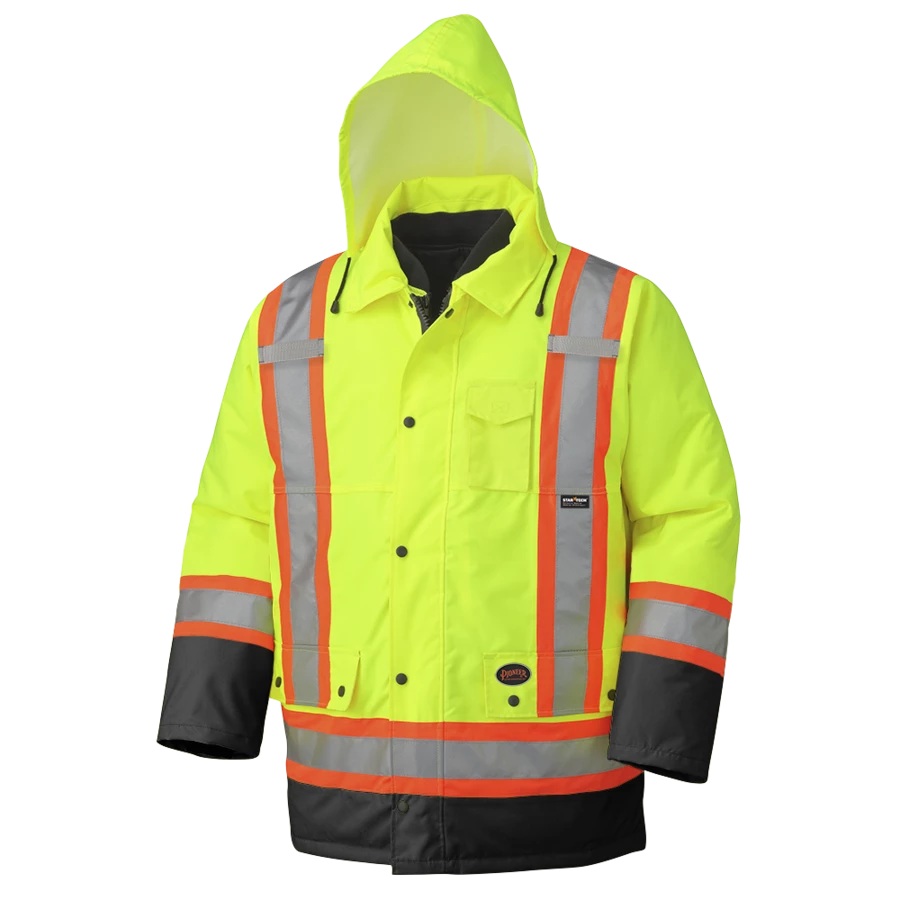 The inner and outer jackets conform to CSA Z96-15 Class 2 Level 2 (as long as sleeves are not zipped off). This garment becomes Class 3 when worn with hi-vis pants with reflective leg bands.