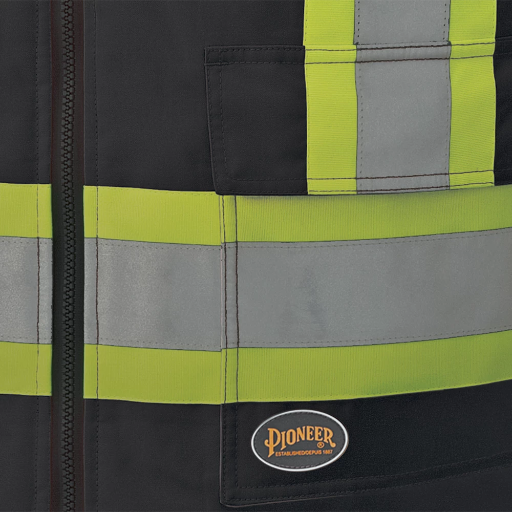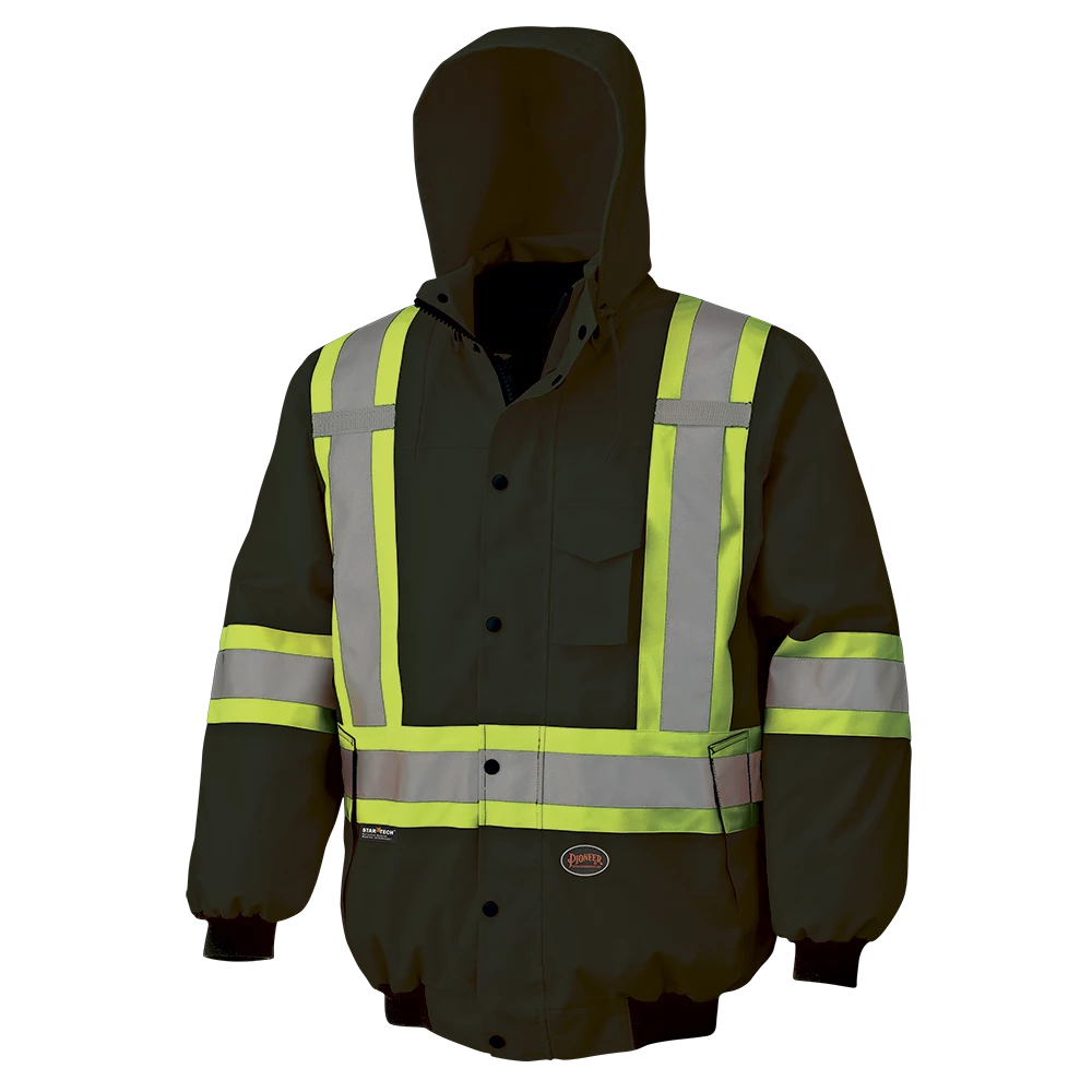 Pioneer’s 6-in-1 reflective striped winter work bomber is highly versatile and employs a unique design that adapts to the weather, your work, and your preferences. The unique black design provides a clean look by helping to hide the effects of contrast with dirt, grease and other soiling materials. 300-Denier oxford 100% polyester outer shell jacket, lining/insulator. Waterproof and windproof Polyurethane (PU) coating on outer shell and inner liner. Taped and heat sealed seams throughout. Equipped with double-stitched Startech reflective striping with 4-inch contrast backing for the ultimate in workplace visibility.