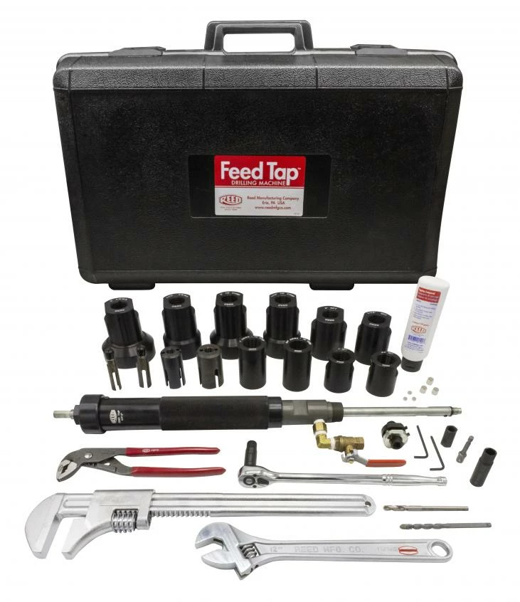 Reed Feed Tap Drilling Machine Kit contains machine, ratchet wrench and socket, corp adapters and cutters to saddle tap plastic pipe only ¾” – 2” for flare, compression and NPT applications.