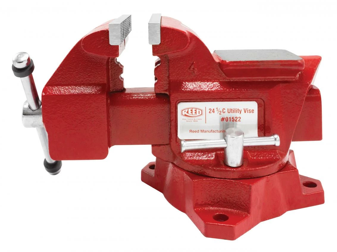 Reed Pipe Fitters Workshop Vise has a heavy-duty design that strengthens this ideal utility workshop vise. Cast vise with pipe jaws, anvil and horn feature a swivel base with positive locking. Hardened steel, serrated jaw facings are replaceable.