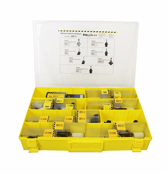 This kit contains an assortment of 6 SKUs of popular Halogen Headlamp Bulbs in a plastic storage tray; 22 bulbs in total