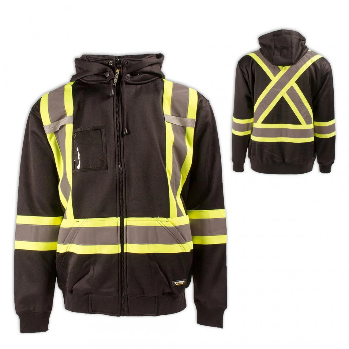 Terra Hi-Vis Fleece Hoodies are made with 100% polyester anti-pill knitted fleece with 2 inch reflective stripe over 4 inch contrast stripe. The detachable hood with 2 levels of snaps is designed to accommodate a hard hat.