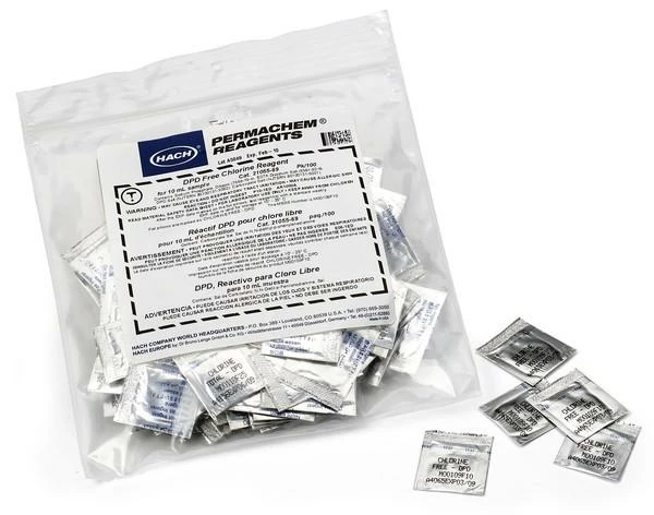 Hach DPD Free Chlorine Powder Pillows are used for free chlorine determination by the DPD Free Chlorine method. They are available in 5 ml, 10 ml and 25 ml sample sizes and provide accurate free chlorine residual results from 0.02 to 2.00 mg/l.